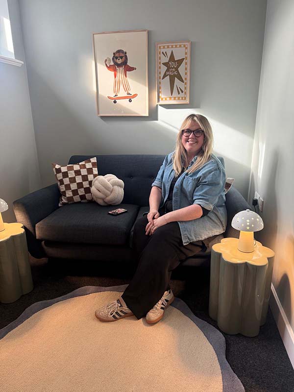 Our in-house interior designer, Marie Pocock, led the transformation. She chose a muted sage green palette, a colour widely recognised for its calming and focusing qualities. This soothing backdrop was paired with thoughtfully selected furniture, soft textures, plants, and soft, layered lighting to create a warm, homely feel. The lighting was key to reducing the harshness of standard classroom fluorescents, making the rooms feel more intimate and inviting.